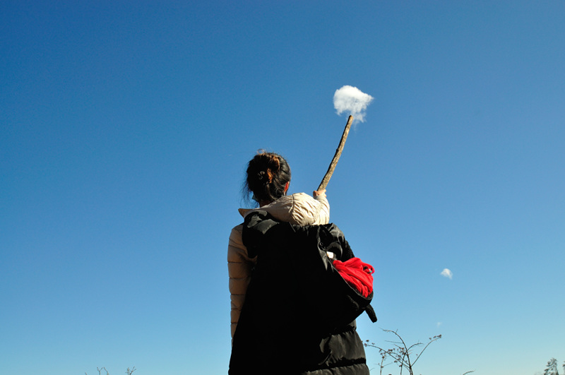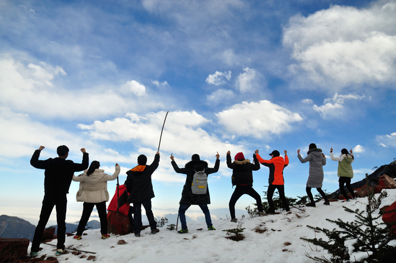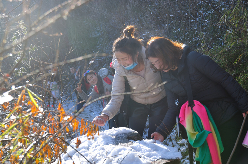 大約1個半小時后,第一片初雪出現,妹紙們可樂壞了,登山的疲憊一掃而空