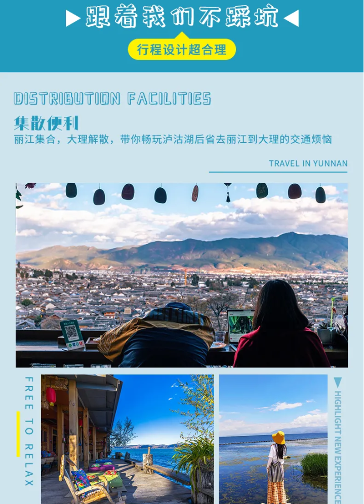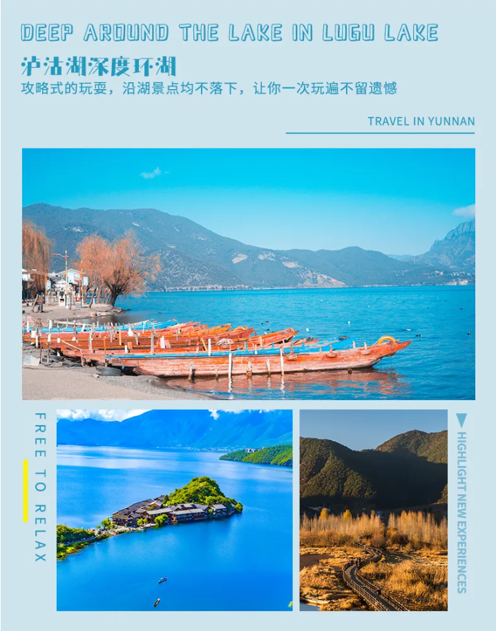 4、門票:瀘沽湖、豬槽船、摩梭講堂;白族扎染;云水花田;