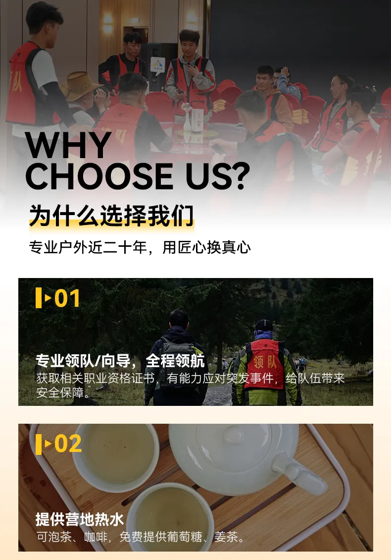 8.我們所設計的產品多為戶外徒步、攝影、登山探險路線,操作流程比較繁瑣也具備一些突發的風險性,天氣、自然災害、地方政策等客觀因素常常會影響原定計劃的實施。應對突發情況時,如大雪封山道路受阻等情況為避免不確定風險領隊有權給出行程變更方案,與全體隊員協商并投票,表決通過,不能因個人冒險行為影響領隊的工作和判斷。