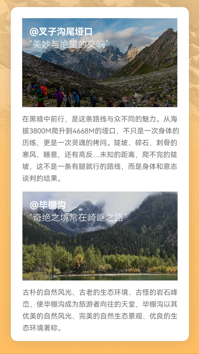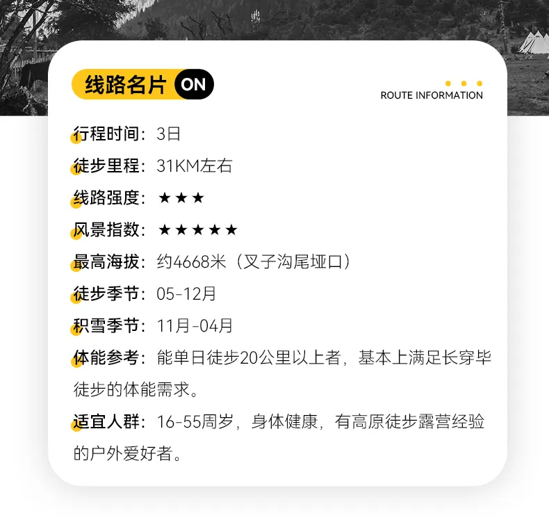 溫馨提示:叉子溝尾營地——木騾子營地這一段路程可選擇騎馬(馬匹數量有限,且此舉為自愿選擇項目,費用自行與當地馬夫協商,安全責任自行負責)