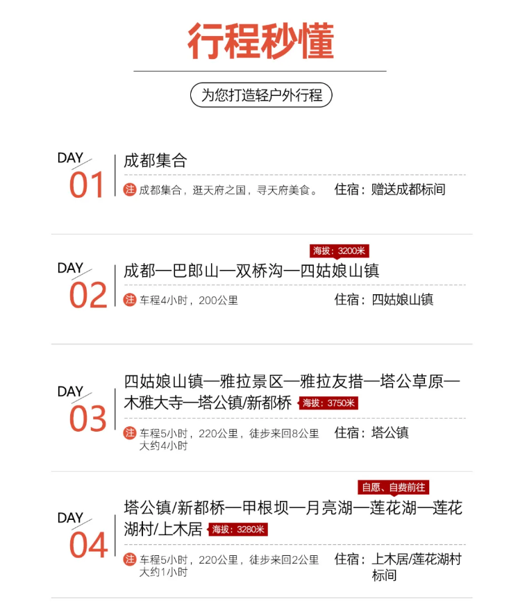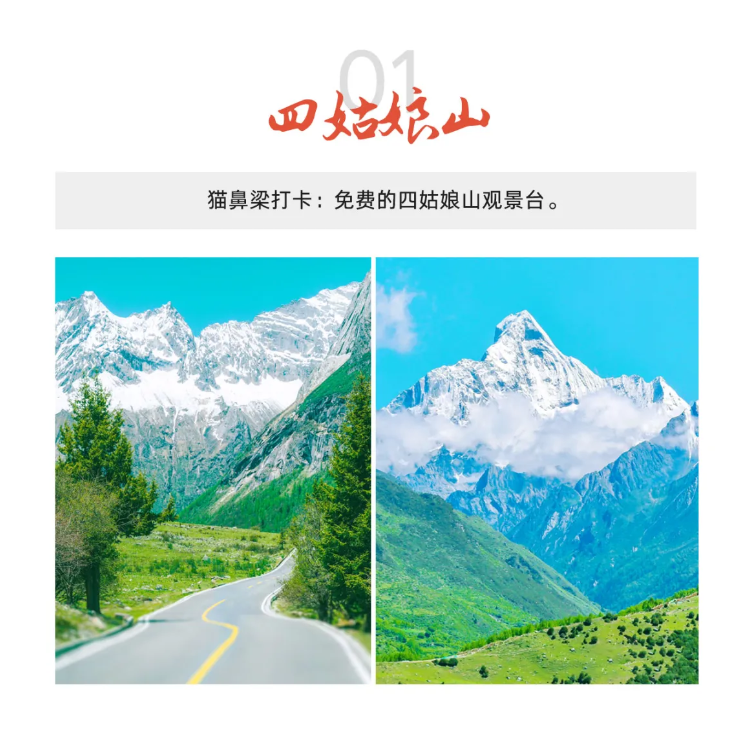 早餐后,經(jīng)過熊貓大道,巴郎山,天氣好可以在貓鼻梁處打卡,這是一處免費觀看四姑娘山的觀景臺,在這個位置可以遠眺四姑娘山四座雪山的全景,從高到低,蔚為壯觀,而后入住四姑娘山鎮(zhèn),適應高海拔。