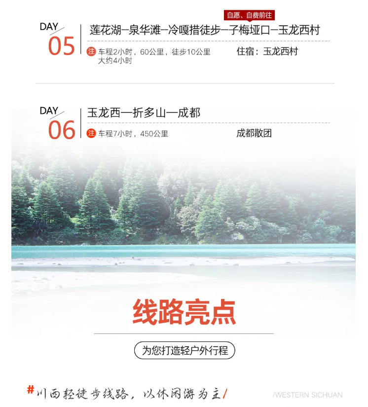 2、全程景區(qū)門票及觀光車費,景區(qū)環(huán)保費(雙橋溝門票及觀光車費、雅拉雪山景區(qū)門票及觀光車費、木雅大寺,泉華灘,冷嘎措環(huán)保費),玉龍西村至子梅埡口車費(自選)月亮湖-蓮花湖中轉(zhuǎn)車自理(自選);