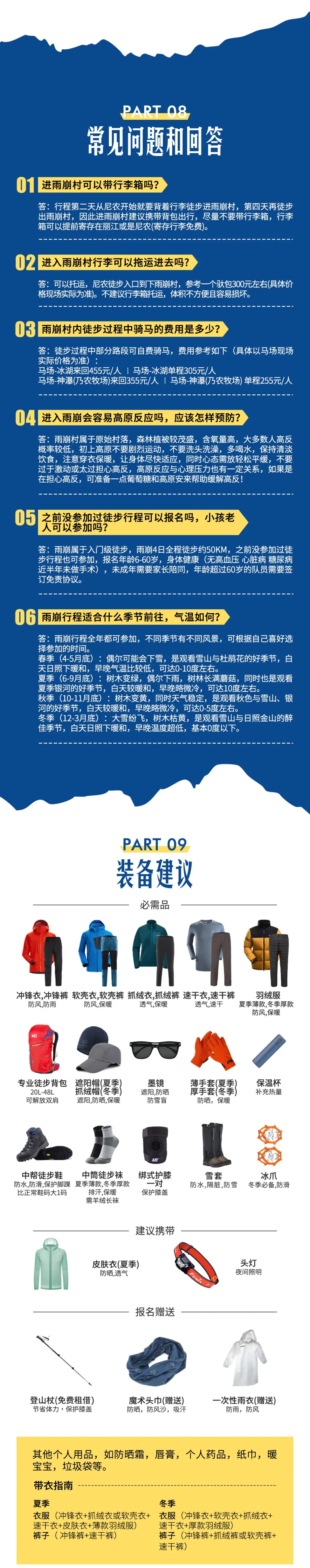 3.雨崩早晚比較冷,需準備手套、帽子、透氣保暖內衣、加絨沖鋒衣,沖鋒褲,一件羽絨服備用,徒步過程中可能會比較熱,需備速干衣。