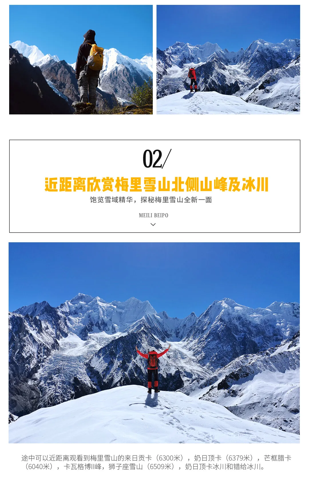 ?早上天氣好可以拍攝梅里北坡日照金山。早餐后出發,離開營地通過一個小牧場后開始爬埡口。先經過一段很陡的碎石坡,之后繼續沿山體爬升,到達4500米的冰川谷遺跡腹地,繞過面前的側磧壟,繼續向上,到達次丁埡口——本次行程的難點之一。一路都可觀賞到奶日頂卡冰川,途中可以多個角度拍攝冰川。埡口之后走Z字形,下降300多米,到達谷底,便是坡將上方營地,海拔4450米,身后便是滇藏交界的5200埡口,這里電信、移動有4G信號。
