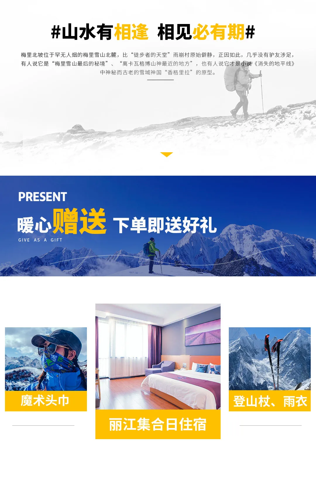 9、贈送說明:不參加不退費原則。本行程免費贈送麗江住宿(提前7天以上報名方可贈送)、提供雨衣、登山杖免費使用,不使用則無費用退還;