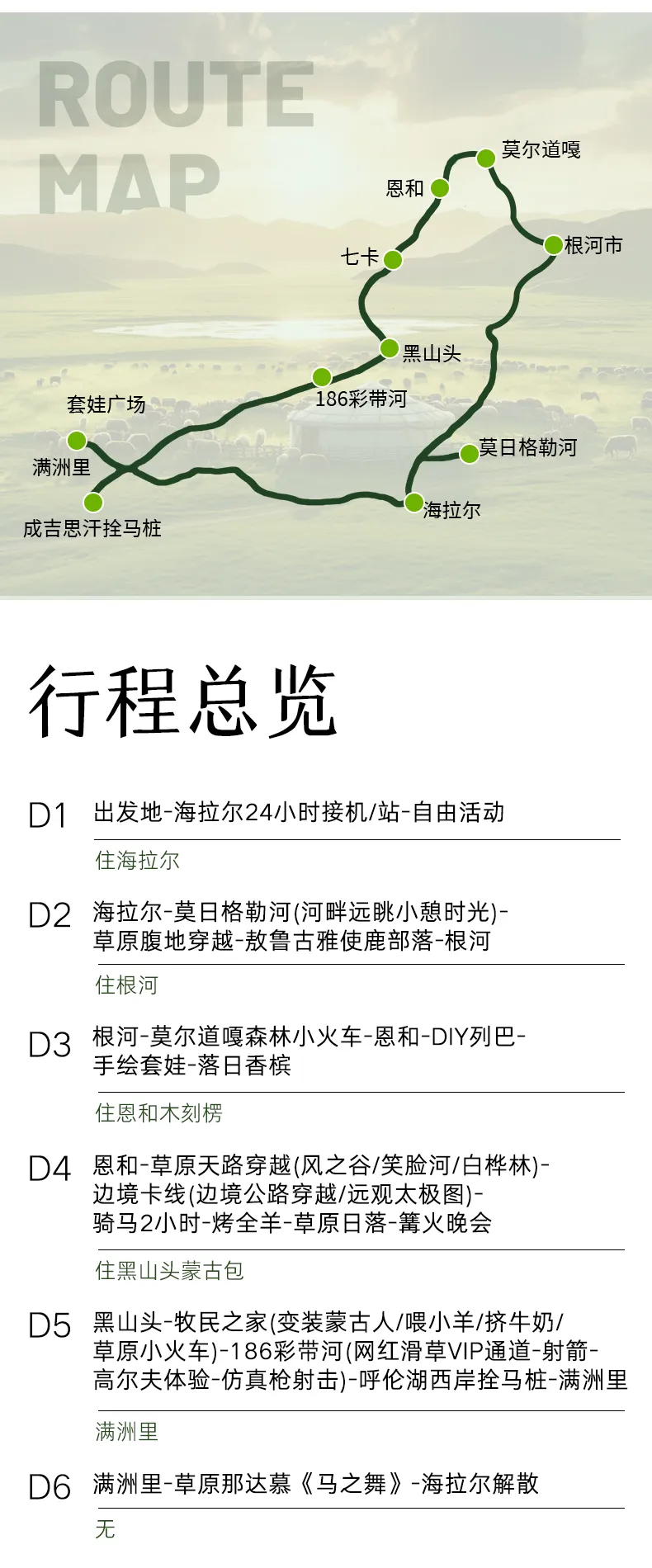 黑山頭---牧民之家(變裝蒙古人/喂小羊/擠牛奶/草原小火車)---186彩帶河(網紅滑草VIP通道---射箭---高爾夫體驗---仿真槍射擊)(57KM,車程約1小時) ---呼倫湖西岸拴馬樁(240KM,車程約3.5小時)---滿洲里(95KM,車程約1.5小時)