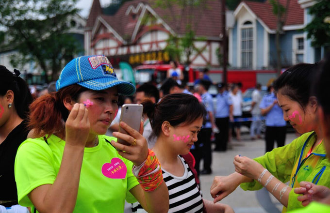 簽到后的跑友們,玩起了熒光DIY游戲,互相涂抹熒光粉、繪制熒光趣味圖案: